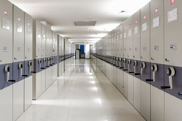 7、手搖移動密集架各列之間裝有磁性吸力的橡膠密封條裝置,該密封條經(jīng)防老化處理。在架體頂部裝有防塵板,底部裝有防鼠檔、合攏后無縫隙,達到了防火、防塵、防鼠、防倒的要求。